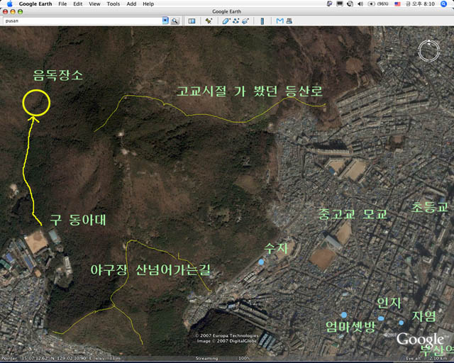노란 큰 원이 아마 내가 약에 취해 잠 든 곳일겁니다. 그 오른쪽 산 능선길은 부산 사람이 노상 보는 산모양입니다. 그 아래 내 모교가 있고 도 누구 누구네 집이 있는데