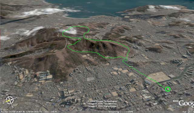 사진 속 초록점은 황령산 정상 바로 아래 포장길 매점이 있는 곳으로