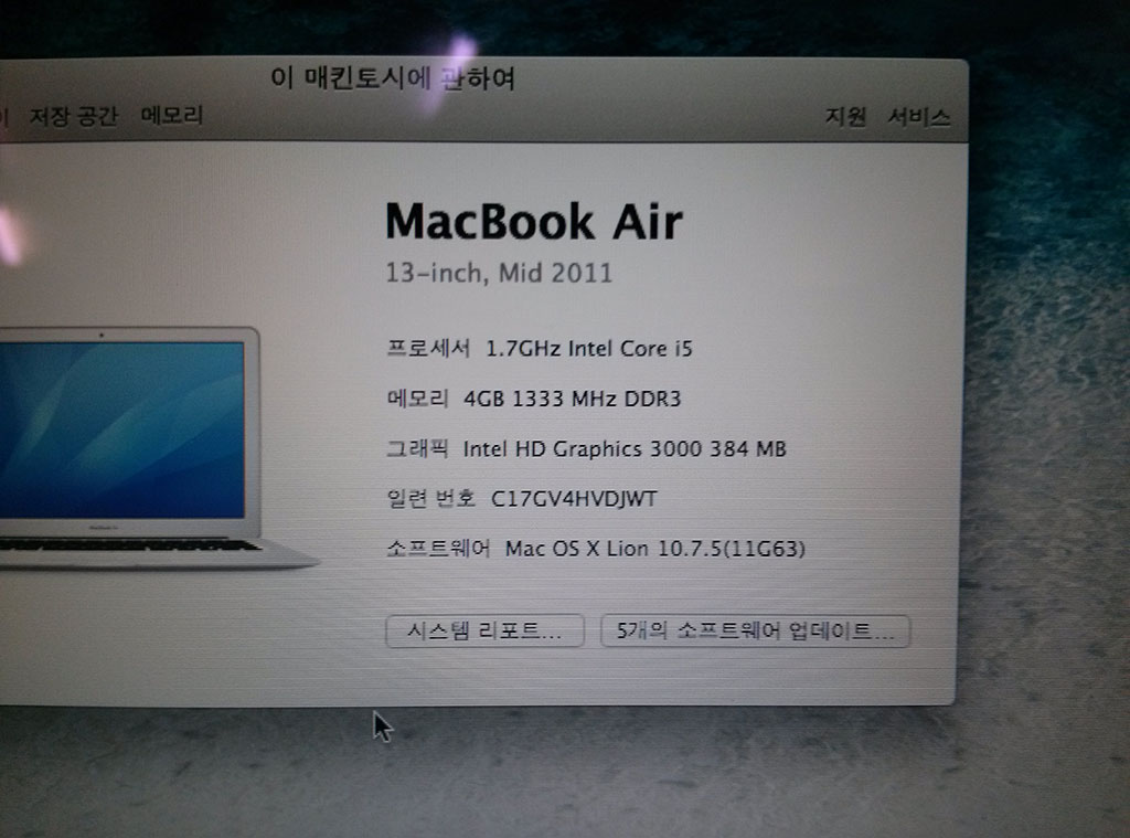 중고 맥북에어(Macbook Air) 13인치 11년 (i5 / 4G / 128G) MC965KH/A) 판매 합니다.