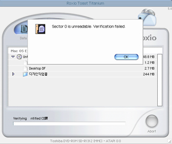 아님 verify를 하지 말고 바로 eject 하시던지요...아님 토스트 프로그램버전이 안맞던지.....
