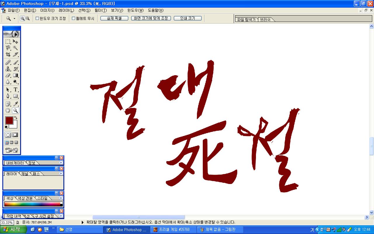 정중히 캘리 부탁드립니다. -_- 류재철 일반 0 5558 2009.11.16 11:18 실력자 분들이 많이 계셔서 이렇게 염치없게 부탁드립니다. - 절대死절 : 첨부한 파일 참고해주시면 감사하겠습니다.(약간 거친느낌? ^^;;) : '절'자의 ㅈ은 가위로...^^;; : 포스터 제작용이라 ai 파일이 필요합니다. 대학동아리 연극공연 포스터로 쓸 예정입니다. 비상업적인 공연이라 이렇게 부탁드립니다.